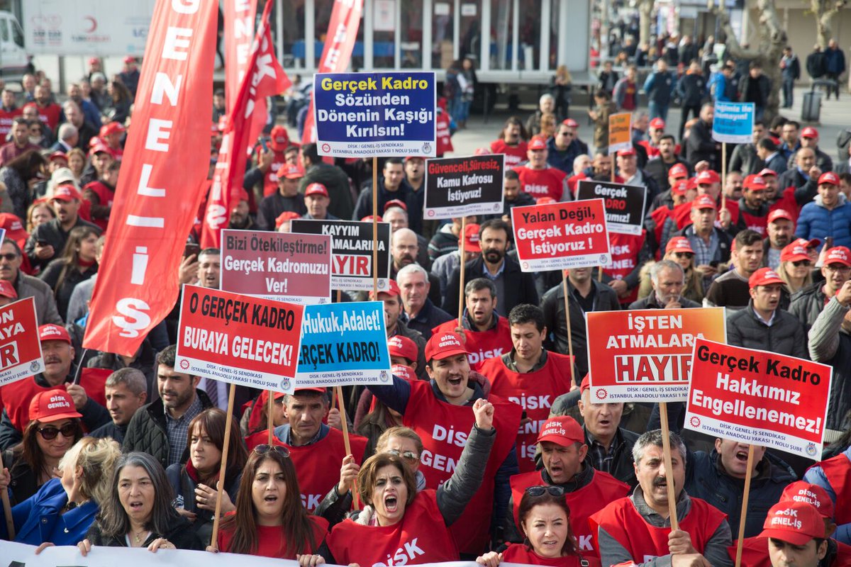 Tezgah şöyle işledi. Geçmişte Türk-İş ile hükümet arasında imzalanan çerçeve protokoller işkolu sendikalarının tek tek kendi toplu iş sözleşmelerini bağıtladığı bir referans noktası olur iken, bu düzen 696 sayılı KHK ile değiştirildi. Konfederasyonların imzaladığı protokoller işkolu sendikaları için de bağlayıcı hale geldi. Ancak pazarlıkların uyuşmazlıkla sonuçlanması durumunda işkolu sendikalarının başvurabileceği grev hakkı, konfederasyonlara verilmedi. Anayasa’ya aykırı bu düzenleme ile işçi tarafının eli kolu bağlanarak, grev hakkı olmayan bir toplu pazarlık süreci dayatıldı. Bu dayatmaya DİSK dışında bir itiraz gelmedi. Türk İş Genel Başkanı Ergün Atalay’ın attığı imza ile de, kamu işçileri için grevsiz toplu pazarlık sürecinin başladığı tescillendi. Üstelik, kadroya alındığı iddia edilen ancak çok daha kötü koşullarda, asgari ücretin biraz üzerinde ücretlerle çalıştırılan taşeron işçiler ve belediye şirket işçileri bu protokol kapsamına dahi alınmadan!