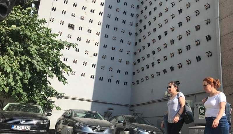 Kabataş’taki bir binanın cephesine mükemmel bir simetriyle dizilmiş hepsi ‘siyah ve topuklu’, 440 çift kadın ayakkabısını gördünüz mü?