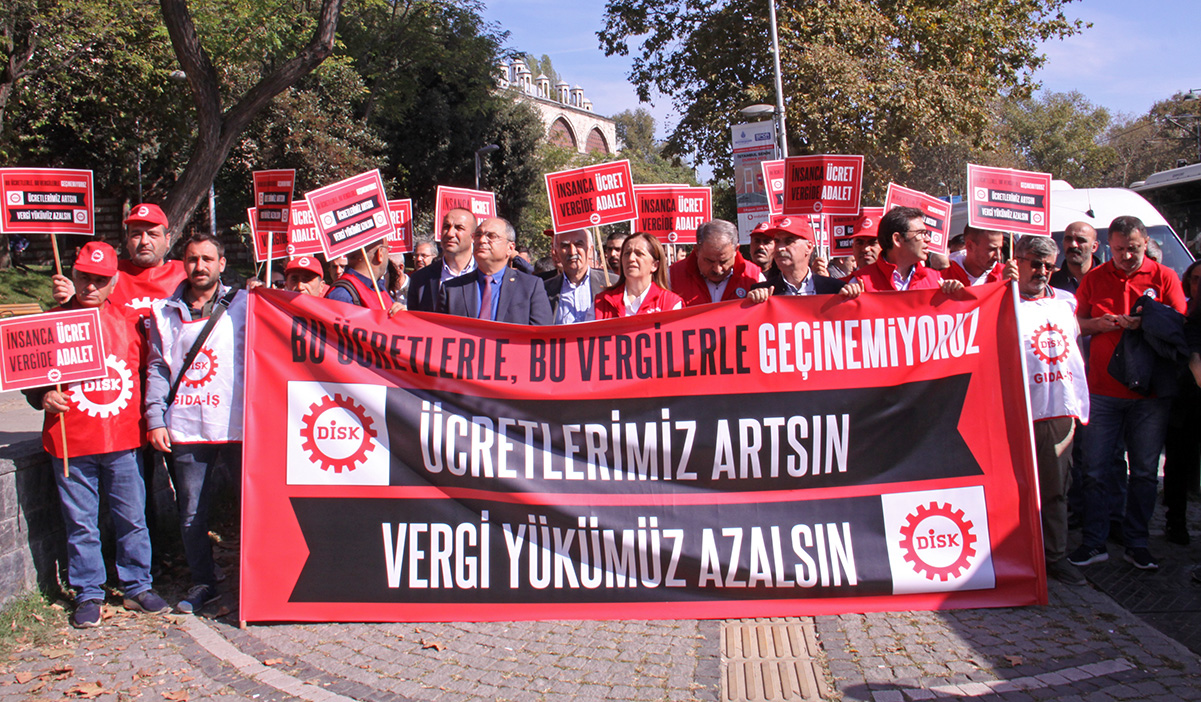 “Bu ücretlerle, bu vergilerle geçinemiyoruz: Ücretimiz artsın, vergi yükümüz azalsın” yazılı pankartın açıldığı eylemde, sık sık “İnsanca ücret, vergilere adalet”, “İnsanca bir yaşam istiyoruz”, “İnadına sendika, inadına DİSK” sloganları atıldı.