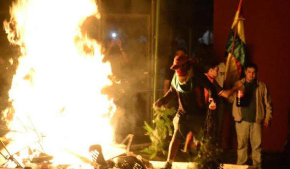 Sayımlara verilen 24 saatlik aranın ardından farkın kapanması, muhalefetin hile yapıldığı iddialarını ateşlerken sokaklarda da gösteriler başladı. Karanlığın çökmesiyle Tarija ve Sucre şehirlerinden protestocular seçim sandıklarını yaktı ve oy kullanma merkezlerini ateşe verdi.