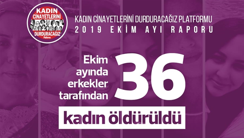 Kadın Cinayetlerini Durduracağız Platformu, 2019’un Ekim ayı kadın cinayetleri raporunu paylaştı. Raporda geçtiğimiz ay 36 kadının erkekler tarafından öldürüldüğü belirtilirken “Cinsel şiddet ve çocuk istismarı” devam ediyor denildi.