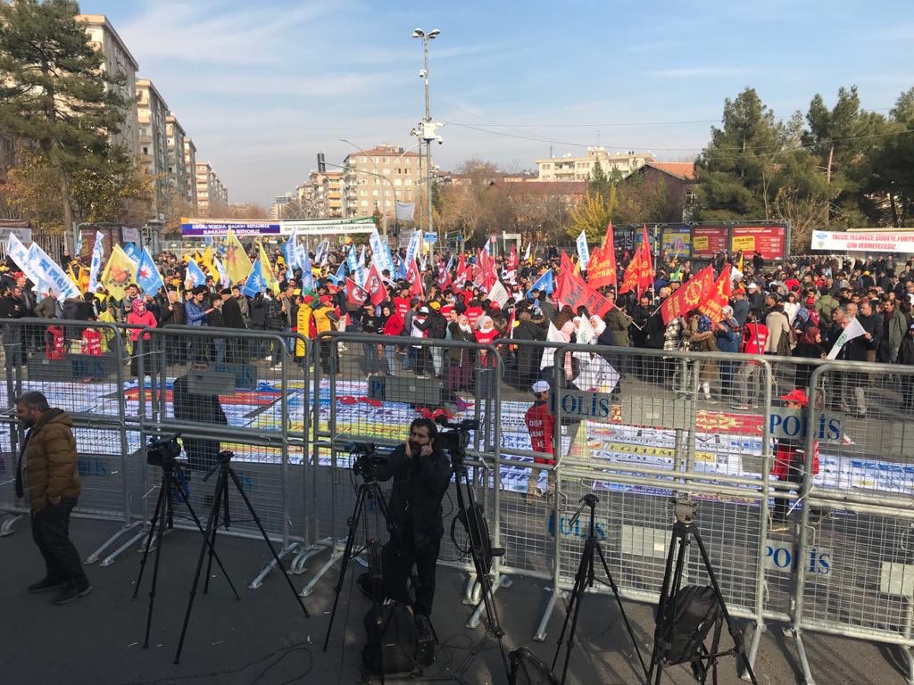 Diyarbakır’da, Amed Emek ve Demokrasi Platformu tarafından düzenlenen “Toplumsal barış ve insanca yaşam için demokrasiyi inşa edelim” mitinginde AKP’ye yönelik sert mesajlar verildi. KESK Eş Genel Başkanı Aysun Gezen, ekonominin hali üzerinden hükümete “Bir yandan işsizlikten evine ekmek götüremeyenler ve çaresizlikten intihar edenler, diğer yanda bir yemeğe 50 bin lira verenler var” sözleriyle yüklendi