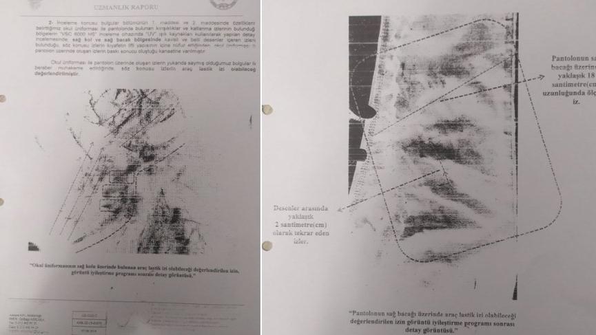 Buna göre Emniyet Genel Müdürlüğü’ne bağlı Ankara Kriminal Polis Laboratuvarı Müdürlüğü tarafından hazırlanan söz konusu uzmanlık raporunda, Rabia Naz Vatan’ın olay günü giydiği kıyafetlerdeki bazı izlerin, “araç lastik izi olabileceği” belirtiliyor. 7 Ağustos tarihli raporda, “Okul üniforması ile pantolonda bulunan kırışıklıklar ve katlanma izlerinin bulunduğu bölgelerin VSC 6000 HS inceleme cihazında morötesi (UV) ışık kaynakları kullanılarak detaylı incelendiği” belirtiliyor.