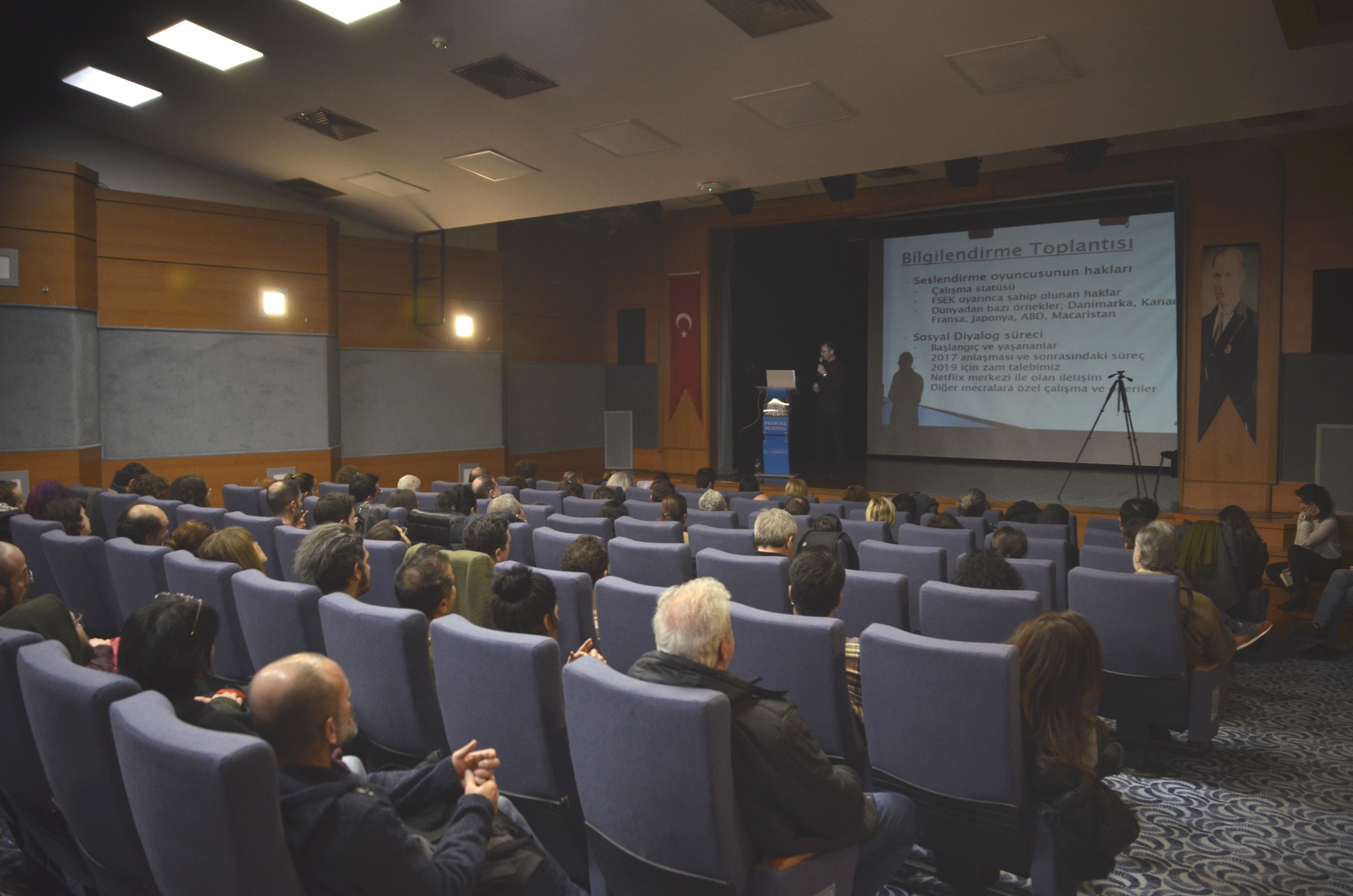 Levent Kültür Sanat Merkezi’nde buluşan yaklaşık 130 seslendirme oyuncusu; seslendirdikleri eserlerin hak devirleri ile ilgili bugüne kadar, iş kaybı kaygısıyla bedelsiz olarak yaptıkları söz konusu devirlerin tüm dünyada olduğu gibi ülkemizde de adaletli şekilde ücretlendirilmesi için harekete geçti ve Oyuncular Sendikası’na stüdyolar ile yürütülecek olan müzakerelerde yetkilendirdi.