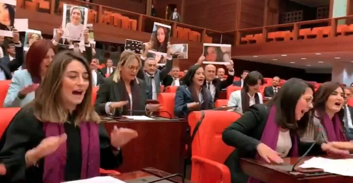 While the female representatives shouted the very same chants that put the women on the streets in jail, other opposition representatives held the pictures of slain women as support in the back seats. The women wore the special lavender scarves symbolizing their solidarity with the women victims of domestic abuse. It is still an irony that women in Turkey are only able to protest the violent attacks under the protection of immunity in the National Assembly while they are not permitted to express their concerns for their lives on the streets.