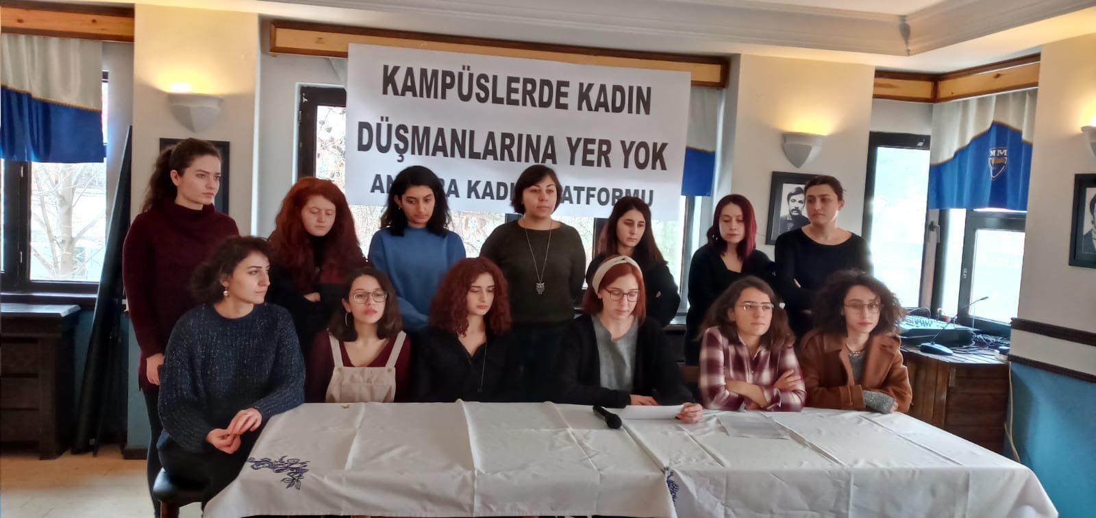 Ankara Üniversitesi Cebeci Kampüsü’nde Las Tesis dansı yapan kadınların TGB tarafından hedef gösterilmesinin ardından gözaltına alınmalarına tepki gösteren Ankara Kadın Platformu, “Kampüslerde, işyerinde, sokakta, evde hayatımızın her yerinde kadın düşmanlarının karşısına mor boyalarımızla isyanımızla çıkmaya devam edeceğiz” dedi