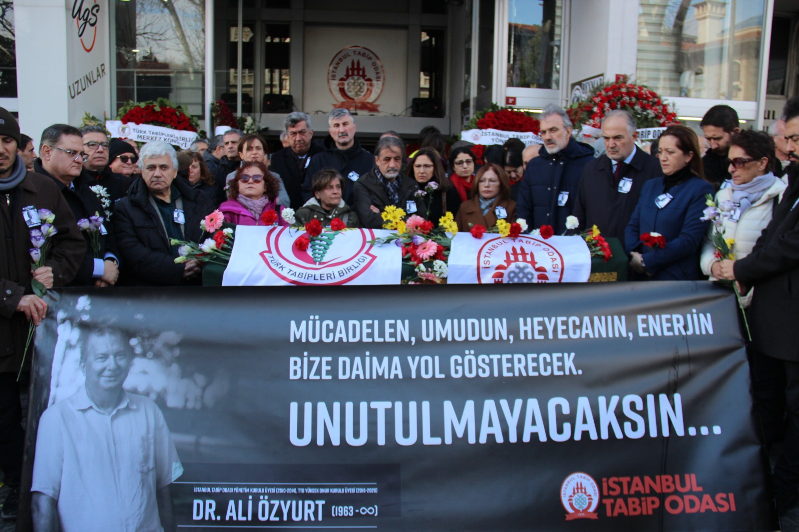 İstanbul Tabip Odası önündeki törene Özyurt’un mücadele arkadaşları ve toplumsal muhalefet örgütlerinden çok sayıda temsilci katıldı.