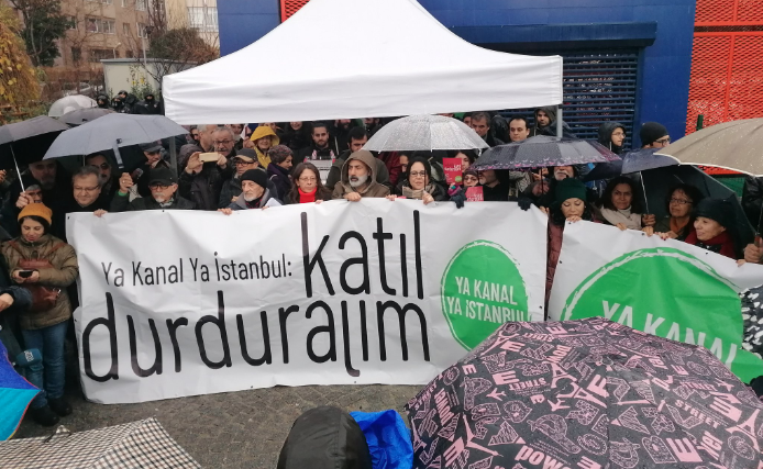 Yoğun yağışa ve polisiye engellemelere rağmen son itiraz dilekçelerini de verdikten sonra basın açıklaması için Çevre ve Şehircilik İl Müdürlüğü binasının önünde bir araya gelen eylemciler “Ya Kanal ya İstanbul, katıl durduralım!” yazılı bir pankart açtı.