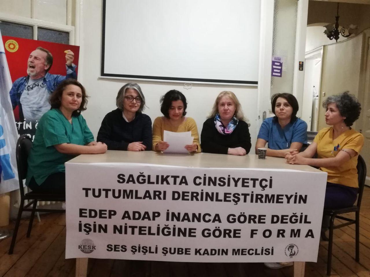 Sağlık ve Sosyal Hizmet Emekçileri Sendikası (SES) Şişli Şubesi Kadın Meclisi, İstanbul İl Sağlık Müdürlüğü tarafından hastanelerde uygulanmak üzere yapılan kılık kıyafet düzenlemesine tepki göstermek amacıyla şube binasında basın toplantısı düzenledi. Açıklamada, “Sağlıkta cinsiyetçi tutumları derinleştirmeyin edep, adap, inanca göre değil işin niteliğine göre forma” yazılı pankart asıldı. Açıklamayı yapan SES Şube Kadın Sekreteri İpek Deniz, sağlık ve sosyal hizmet emekçileri olarak yine sorunlar sarmalıyla karşı karşıya kaldıklarını söyledi.