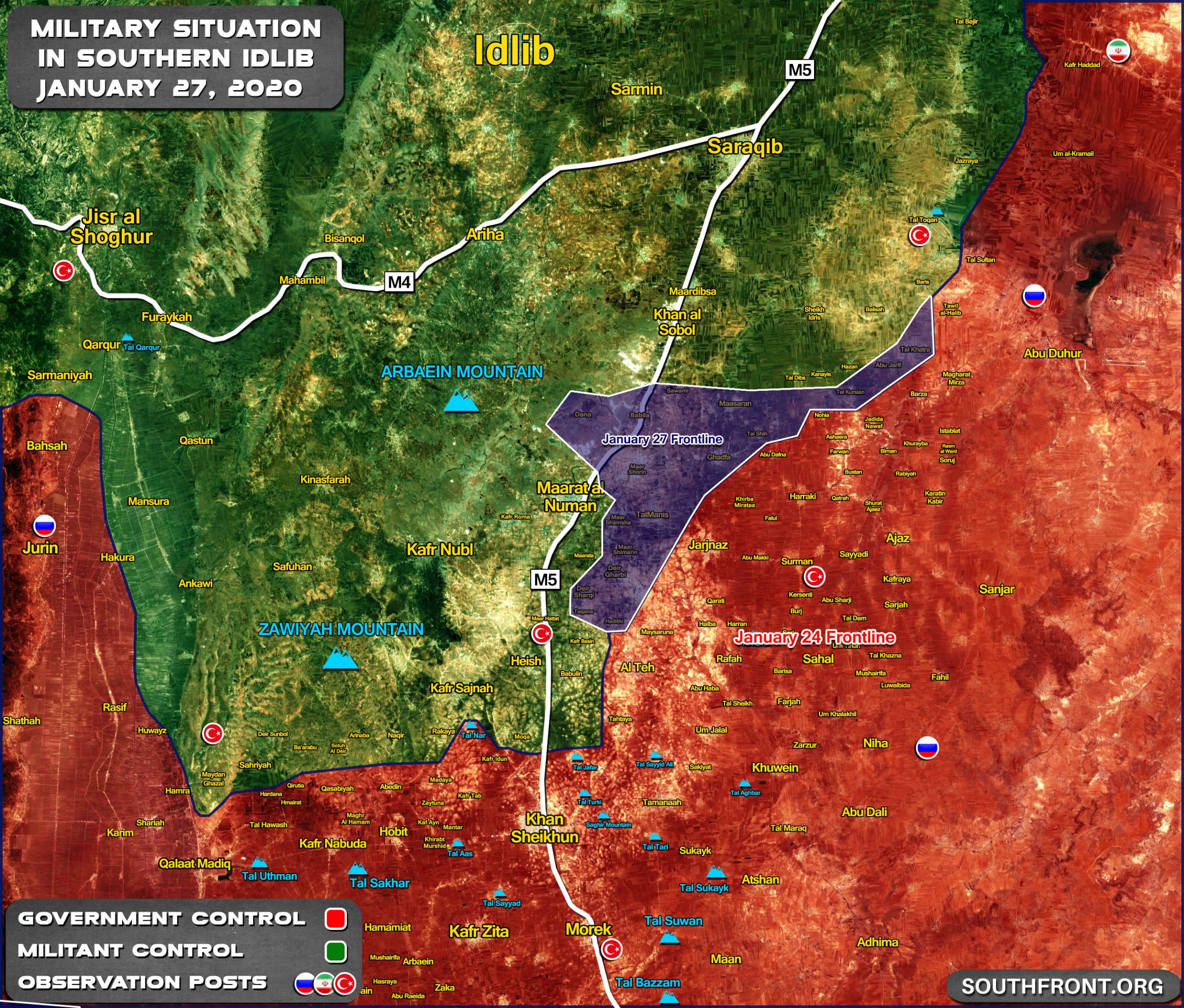 İdlip’in güneyinde Suriye ordusunun ilerleyişini gösteren 27 Ocak tarihli harita. [Kaynak: South Front]