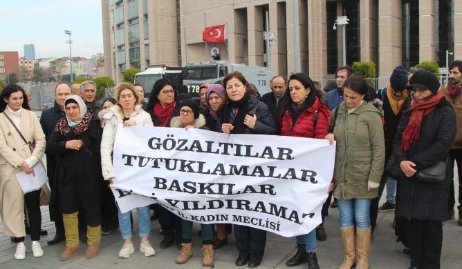 Duruşma öncesinde adliye önünde bir araya gelen HDP İl Kadın Meclisi üyeleri tutuklu yargılanan kadınların serbest bırakılmasını istedi. Açıklamada “Gözaltılar tutuklamalar baskılar bizi yıldıramaz” pankartı açıldı. HDP Milletvekili Züleyha Gülüm, İl Eş Başkanı Elif Bulut, tutuklu yakınları ve çok sayıda yurttaş katıldı. Açıklamada söz alan HDP Milletvekili Züleyha Gülüm, duruşması görülen kadınların asıl tutuklama gerekçesinin erk şiddetine ve egemenliğine karşı gelmek olduğunu söyledi. Ülkede her gün 5 kadının öldürüldüğü, tacize, tecavüze uğradığı bir süreçten geçtiklerini belirten Gülüm, “Buna karşın, iktidarın kadınları koruması gerekirken tam tersine erkek egemenliğini güçlendirdiği, kadınları yok saydığı, erkeğe ve eve mahkum ediyor. İktidar, her gün çıkardıkları yasalarla kadına yönelik şiddeti artırmaya devam ediyor” dedi.