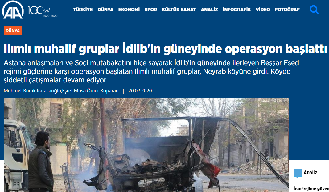 Anadolu Ajansı (AA), cihatçıların propaganda aygıtı gibi çalışmaya devam ediyor. AA, TSK’nin roket-top atışları eşliğinde İdlip kırsalında Suriye ordusu kontrolündeki Neyrab’a saldırı başlatan HTŞ ve müttefikleri için “ılımlı muhalif” ifadesini kullandı.