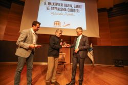 Yeni Yaşam okur temsilcisi Hüseyin Aykol adına törene gelen Yeni Yaşam idare müdürü Mehmet Şahin, ödülü Sendika.Org editörü Vecih Cuzdan’ın elinden aldı.