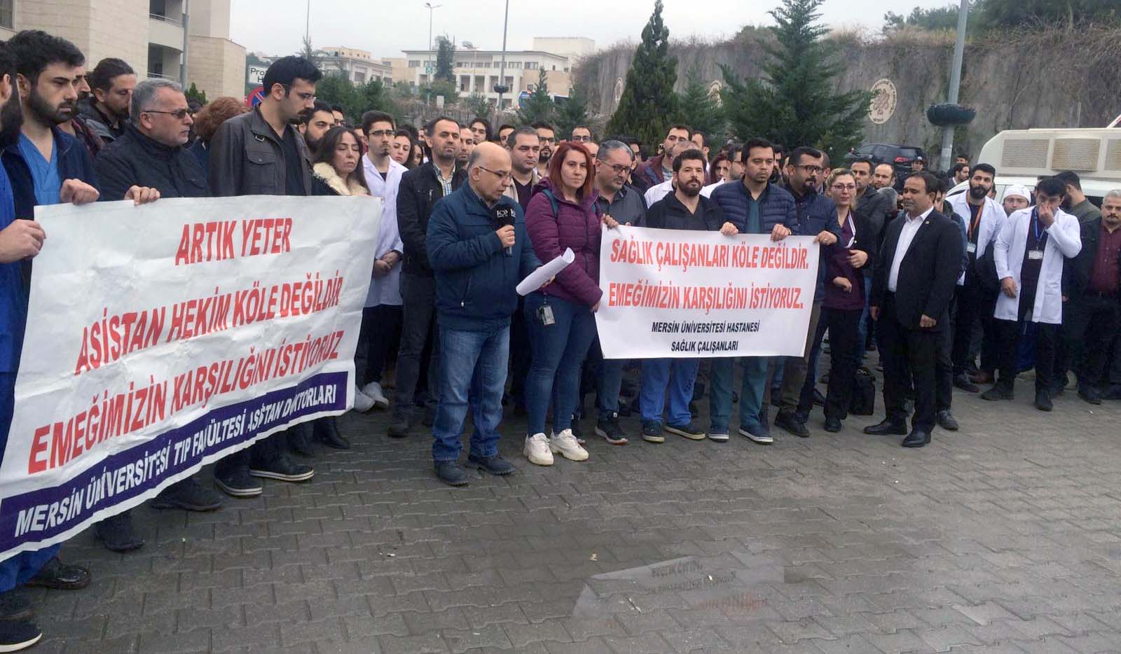 Mersin Tıp Fakültesi sağlık çalışanları ve asistan hekimler iş bıraktı. Döner sermaye, nöbet ve performans gibi ek ücretleri ödenmeyen asistan hekimler, bu kalemlerin neredeyse maaşlarının yarısı olduğunu söyleyerek 2 saat iş bıraktı
