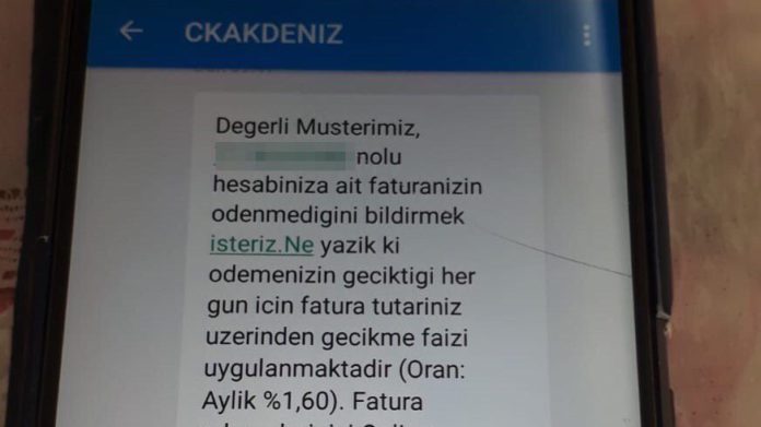 Antalya Sokakları’nda yer alan habere göre elektrik borcunu ödeyemeyen bir yurttaşa, Cengiz Holding ve Kolin İnşaat A.Ş. ortaklığı olan CK Akdeniz tarafından gönderilen mesajda “Ödemenizin geciktiği her gün için fatura tutarınız üzerinden gecikme faizi (1,60 oranında) uygulanmaktadır” denildi.