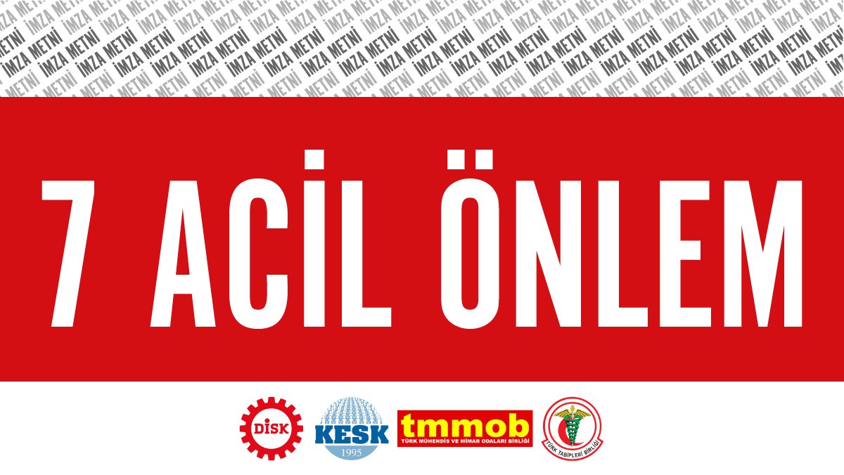 DİSK, KESK, TMMOB ve TTB, halk sağlığının korunması 7 acil önlem çağrısı yaptı. İmza metni DİSK web sitesi üzerinden imzaya açıldı.
