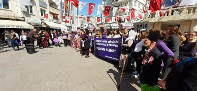 Saat 13:00’da Kemalpaşa’da bir araya gelen kadınlar Kemalpaşa Meydanı’na “Dünya yerinden oynar kadınlar özgür olsa” sloganlarıyla yürüdü.