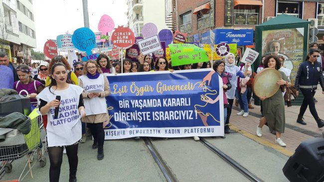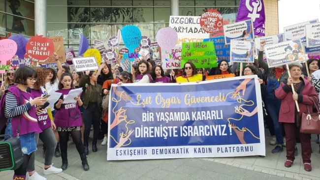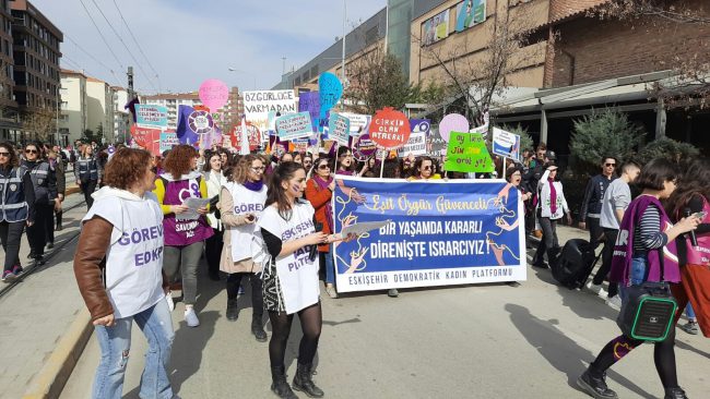 Eskişehir’de kadınlar “Eşit özgür güvenceli bir yasamda ısrarcı, direnişte ısrarcıyız” diyerek Espark Avm önünden Adalar Migros’a yürüyüş gerçekleştirdi.