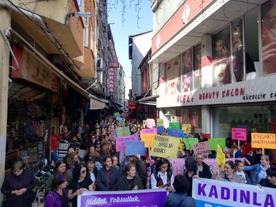 “Krize ve şiddete karşı mücadelede ısrarcıyız” pankartı açılırken, kadınlar ellerinde “Yaşasın 8 Mart”, “Katledilen kadınlar isyanımızdır”, “Kız kardeşlerimizin hesabını soracağız”, “Kadınlar susmayacak özgürce yaşayacak”, “Fıtratımızda direniş var” ve “Nafakama dokunma” yazılı dövizler taşıdı.