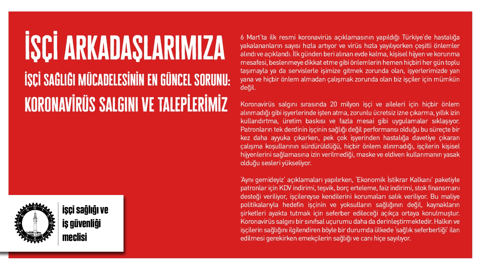 Koronavirüs salgını sırasında 20 milyon işçi ve aileleri için hiçbir önlem alınmadığı gibi işyerlerinde işten atma, zorunlu ücretsiz izne çıkarma, yıllık izin kullandırtma, üretim baskısı ve fazla mesai gibi uygulamaların sıklaştığını kaydeden İSİG Meclisi, açıklamada şunları kaydetti: