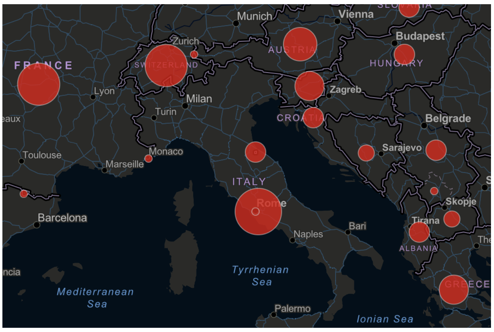 Haritaya göre Arnavutluk’ta 42 kesinleşmiş vaka söz konusu iken İsviçre’de bu sayı 2,200’e, İtalya’da ise 21,157’ye ulaşıyor. Üç baloncuğu buraya kopyalıyorum. Sola, tablodaki baloncukları kopyaladım (korkunç derecede yanlışlar) sağa ise sihirli formül teorisini R2= (KAREKÖK(yeni değer/en küçük değer))xR1 uygulayarak, Arnavutluk baloncuğunu temel alarak (R1) her bir baloncuğun gerçek boyutunu hesaplıyorum. Sonuçlar bir hayli sarsıcı, ancak baloncuklardaki COVID-19 vaka sayısının gerçek verilerle orantılı ve doğru bir şekilde aktarıldığını görüyorum.