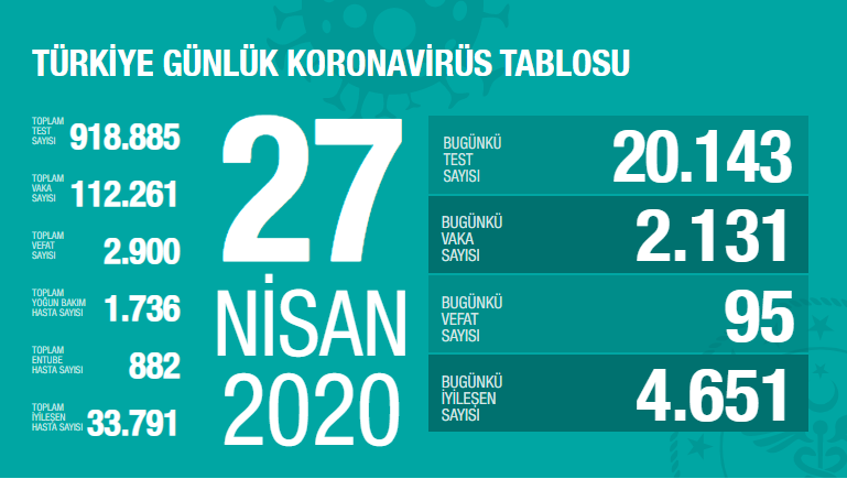 Sağlık Bakanı Fahrettin Koca, günlük (27 Nisan) COVID-19 verilerini açıkladı. Bugün yapılan test sayısı 20 bin 143 olurken 2 bin 131 kişinin testi pozitif çıktı. Bugünkü verilere göre COVID-19 sebebiyle yaşamını yitiren yurttaşların sayısı 95 oldu. Toplam vaka sayısı da 112 bin 261’e yükseldi.