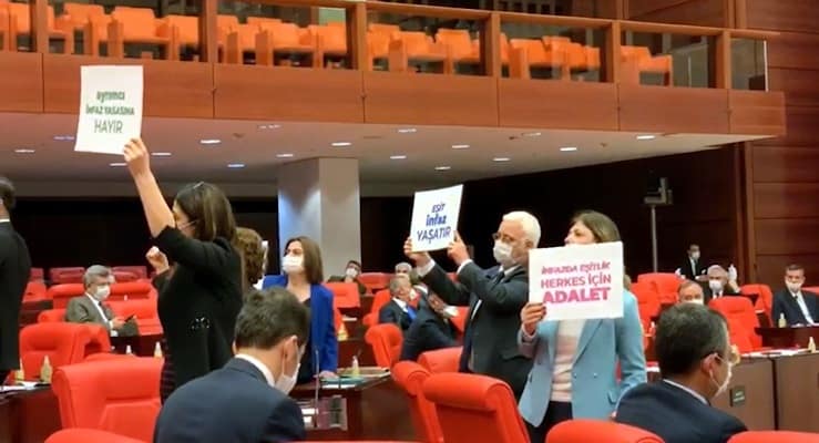 HDP teklifi “İnfazda eşitlik istiyoruz”, “Ayrımcı infaz yasasına hayır”, “Eşit infaz yaşatır” yazılı dövizler açarak ve sıra kapaklarına vurarak protesto etti.