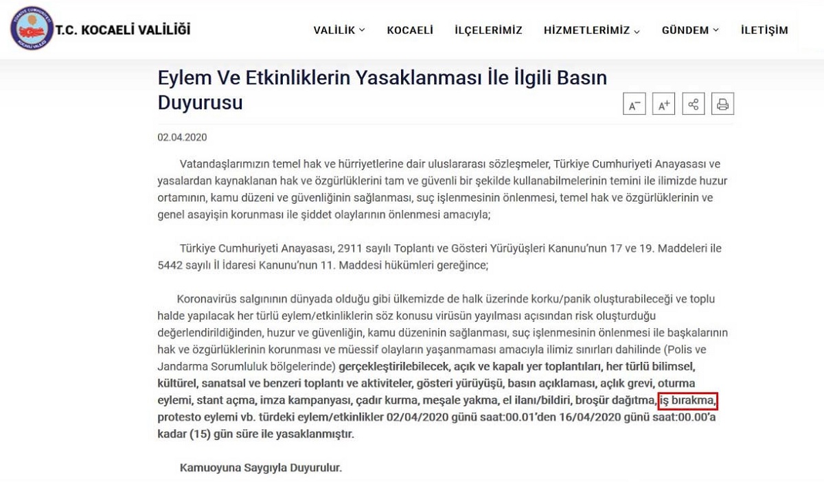 Kocaeli Valiliği dün (2 Nisan) COVID-19 salgınını gerekçe göstererek “iş bırakma” dahil bütün eylem ve etkinliklerin yasaklandığını duyuran bir genelge yayımladı. Yasaklama kararının, işçiler arasında COVID-19 vakalarının çıktığı işyerlerinde, patronun üretimin durdurmaması çalışanların iş bırakma eylemlerine başvurmasının ardından gelmesi dikkat çekti. Ne var ki tepkilerin ardından, valiliğin resmi internet sayfasındaki genelgede geceyarısı bir değişiklik yapılarak “iş bırakma” ifadesi çıkarıldı.