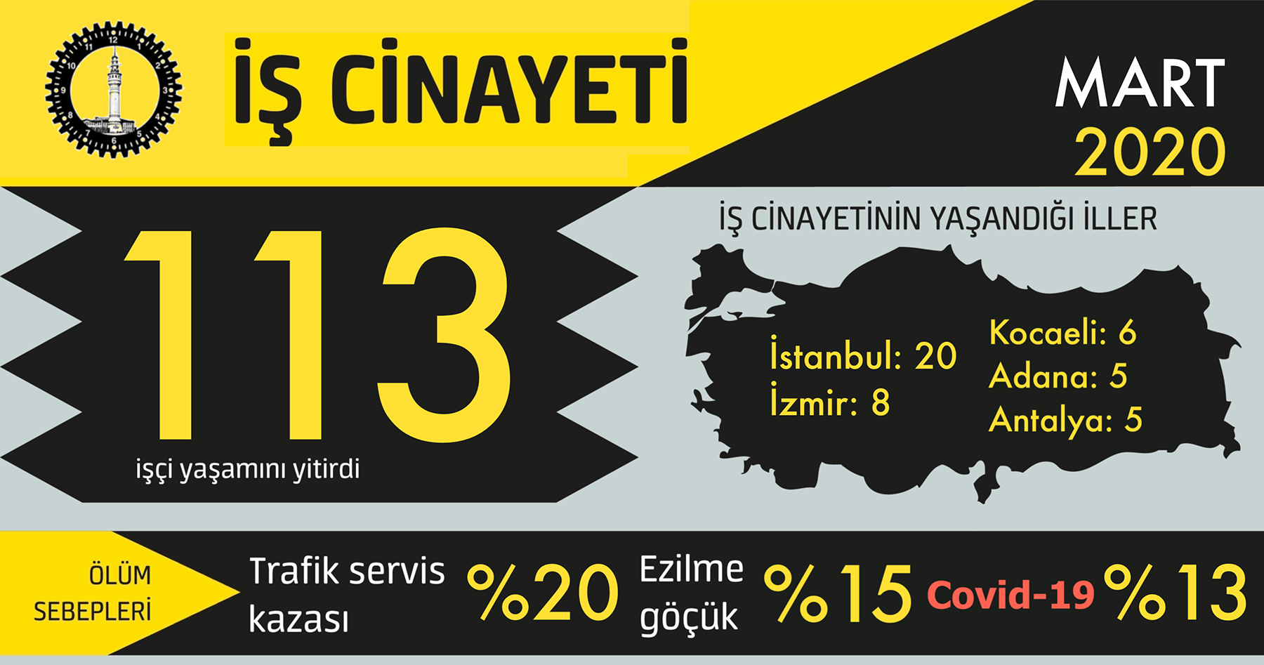 İşçi Sağlığı ve İş Güvenliği (İSİG) Meclisi’nin verilerine göre, geçen mart ayı boyunca 14’ü korona virüsünden olmak üzere en az 113 işçi öldü. Yayımlanan raporda, koronavirüsü (COVID-19) nedeniyle ölen işçi sayısının daha fazla olabileceği ancak şu an sağlıklı veriye ulaşılamadığı belirtildi