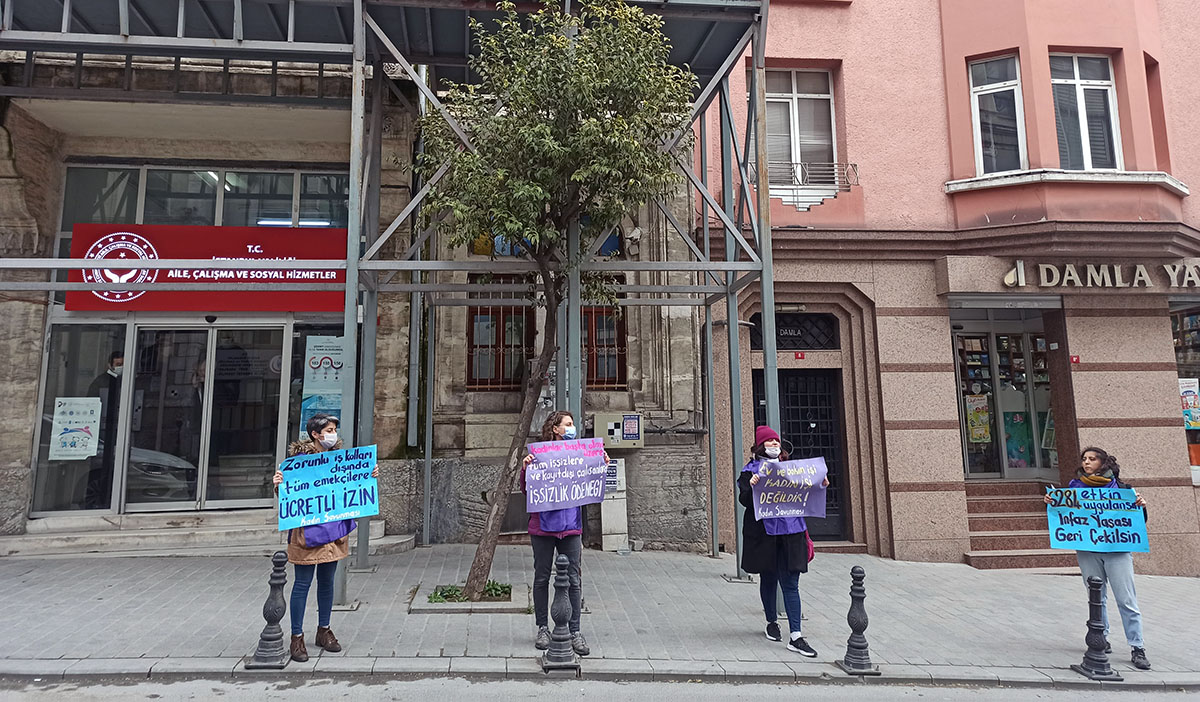 Koronavirüs (COVID-19) salgınına rağmen “zorunlu” olarak eylem gerçekleştirdiğini belirten Kadın Savunma Ağı’ndan kadınlar, “Zorunlu işkolları dışında tüm emekçilere ücretli izin”, “Kadınlar başta olmak üzere tüm işsizlere ve kayıtdışı çalışanlara işsizlik ödeneği”, “Ev ve bakım işi, kadın işi değildir”, “6284 etkin uygulansın, infaz yasası geri çekilsin” yazılı dövizler taşıdı. Sosyal mesafe kuralına uyulan eylemde, basın açıklaması dört kadın tarafından parça parça okundu.