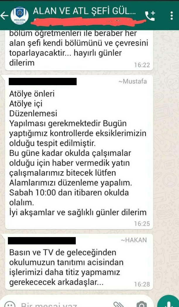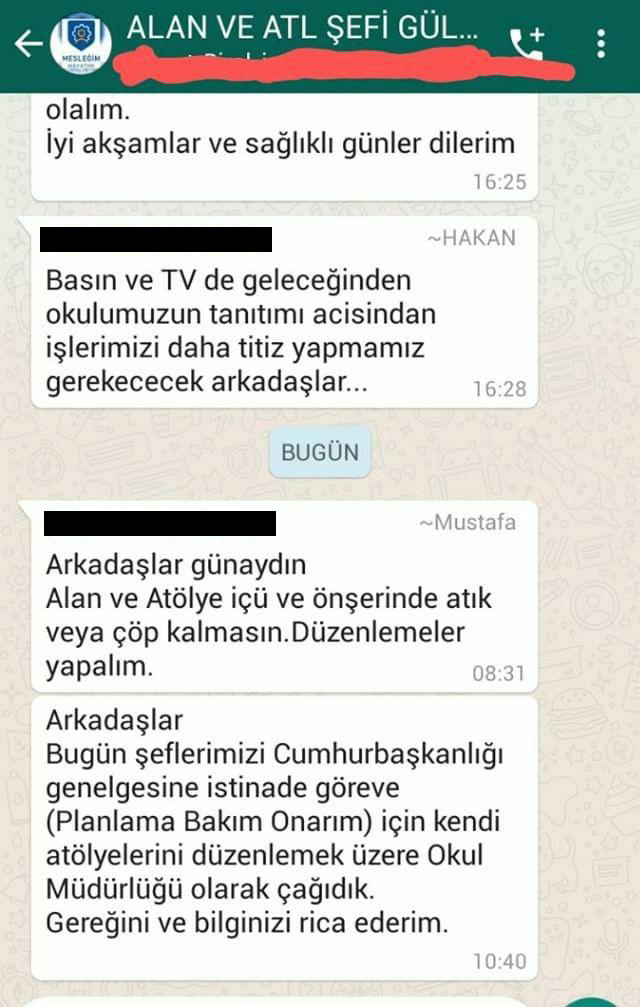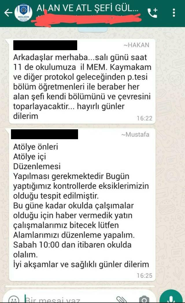 Öğretmenlerin Whatsapp grubuna yansıyan konuşmalarda Teknik Müdür Yardımcısı Hakan Kızılbayrak, İl Milli Eğitim Müdürü, Kaymakam ve diğer protokol görevlilerinin okula geleceği gerekçesiyle öğretmenleri okula çağırdı. Alan şefi öğretmenlerin kendi bölgelerini temizlemeleri ve çöplerini toplamalarını istedi.