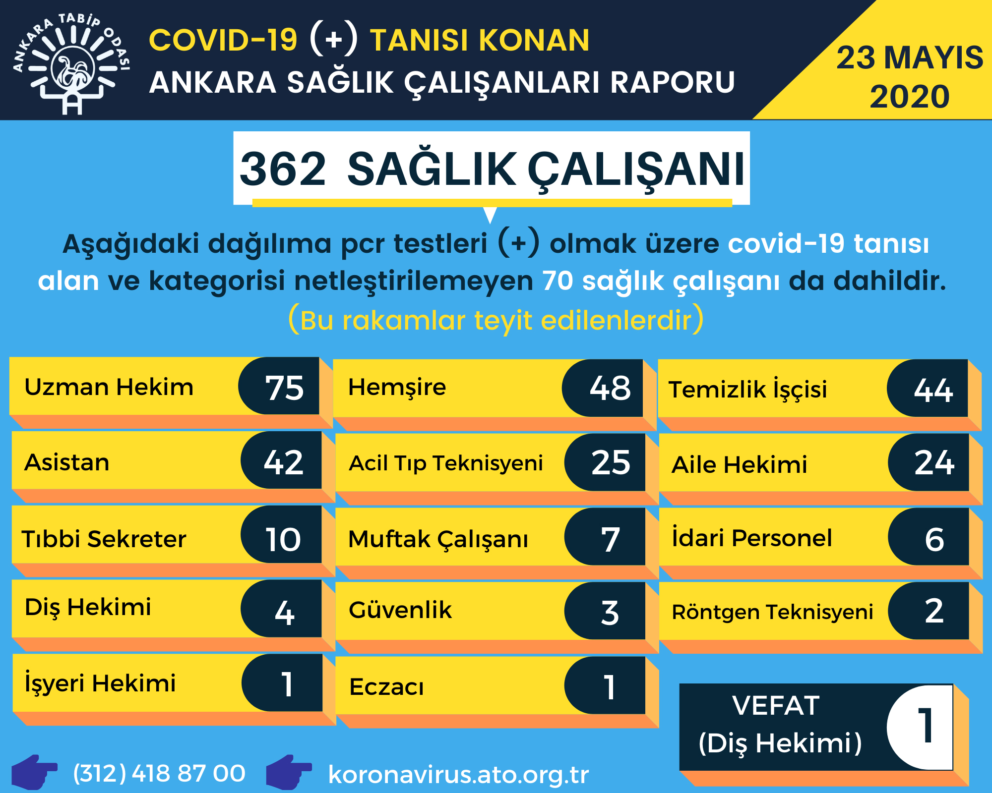 Konuyla ilgili sosyal medyada paylaşım yapan ATO, “23 Mayıs 2020 tarihi itibariyle Ankara Tabip Odası Yönetim Kurulu tarafından ulaşılan ve teyit edilen Covid-19 (+) tanısı alan sağlık çalışanlarının sayısı 362’ye yükselmiştir” dedi.