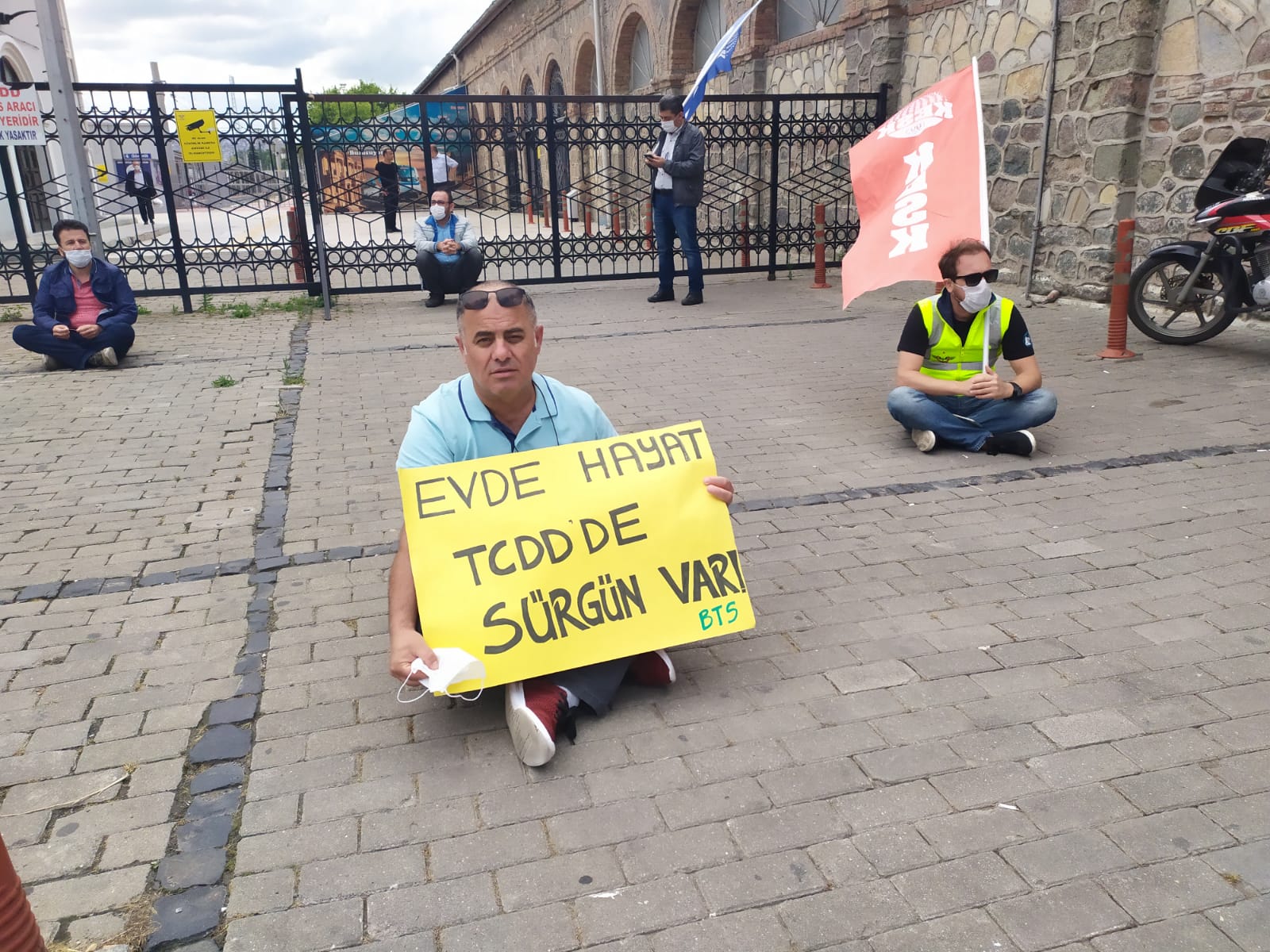 Demiryolcuların sürgün edilmesi ile ilgili BTS üyeleri bugün (28 Mayıs 2020) Ankara’da TCDD Genel Müdürlüğü protokol kapısı önünde, TCDD Bölge Müdürlükleri ve bube binaları önlerinde basın açıklamaları ve ardından oturma eylemi yaptı.