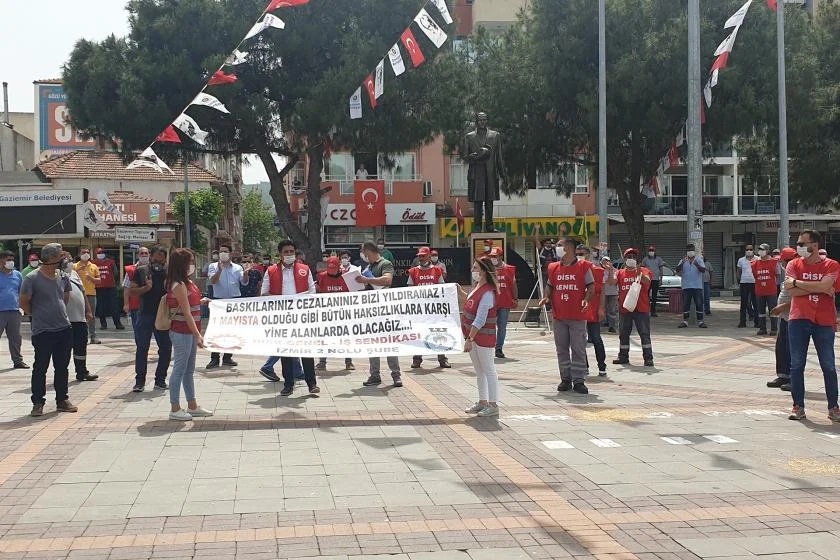 Gaziemir Meydanında yapılan açıklamayı Genel-İş 2 No’lu Şube Başkanı Arif Yıldız gerçekleştirdi. Yıldız, “1 Mayıs günü Gaziemir Belediyesi önünde yapmış olduğumuz etkinlikle ilgili olarak Gaziemir Kaymakamlığı tarafından aralarında sendika yöneticilerimizin de olduğu 17 kişiye “sokağa çıkma yasağını ihlal” kabahati nedeniyle her bir işçiye 3150’şer TL idari para cezası kesildiğini bugün resmi olarak öğrenmiş bulunuyoruz. Resmi olarak diyoruz çünkü, söz konusu cezayı bizler ve kamuoyu ilk olarak Gaziemir Belediyesi AKP’li meclis üyesi Uğur İnan Atmaca’nın birkaç gün önce sosyal medya hesabından yapmış olduğu paylaşımdan öğrenmiştik. Henüz hiçbir arkadaşımıza resmi bir tebligat bile yapılmamışken AKP’li bir belediye meclis üyesinin kaymakamlık tarafından kesilen ve yalnızca ilgili kişilerin resmi tebligatla öğrenmesi mümkün olan bir cezayı hangi ilişkiler ve bağlantılarla öğrenmiş olduğu ise hepimiz tarafından halen merak edilmektedir” dedi.