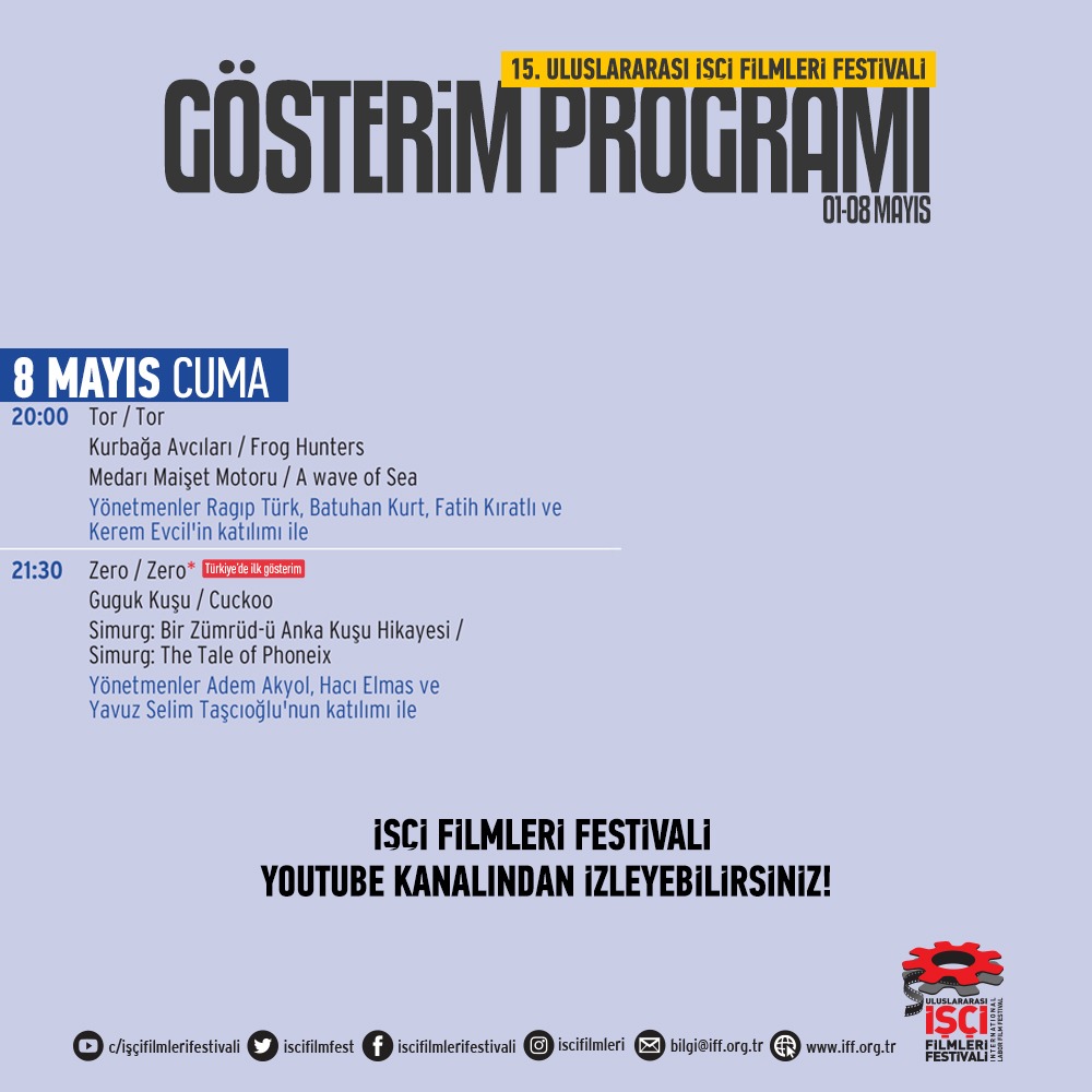 Bu yıl salgın nedeniyle “Evde kalamayanları gör” sloganıyla online düzenlenen 15. Uluslararası İşçi Filmleri Festivali’nin (İFF) 7 Mayıs Perşembe programı kapsamında Tor, Kurbağa Avcıları, Medarı Maişet Motoru, Zero, Guguk Kuşu ve Simurg filmleri gösterildi.