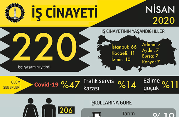 İşçi Sağlığı ve İş Güvenliği (İSİG) Meclisi’nin açıkladığı Nisan ayı raporuna göre, 220 işçi iş cinayetlerinde öldü. İSİG, korona virüsü nedeniyle ölen sağlık emekçilerinin ve evden çalışanlar da dahil faal işçilerin de ölümlerini iş cinayeti olarak değerlendirdiklerini belirtti.