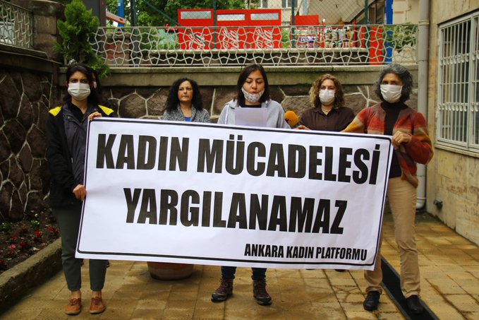 Ankara Kadın Platformu, geçtiğimiz günlerde aralarında Rosa Kadın Derneği üyelerinin, HDP üyelerinin ve bir barış annesinin olduğu kadınların gözaltına alınması ve gözaltına alınanlardan sekizinin tutuklanmasına karşı Mor Mekan’da basın toplantısı gerçekleştirdi. Açıklamada “Kadın mücadelesi yürütenleri değil şiddet, tecavüz, taciz faillerini sorgulayın” denildi