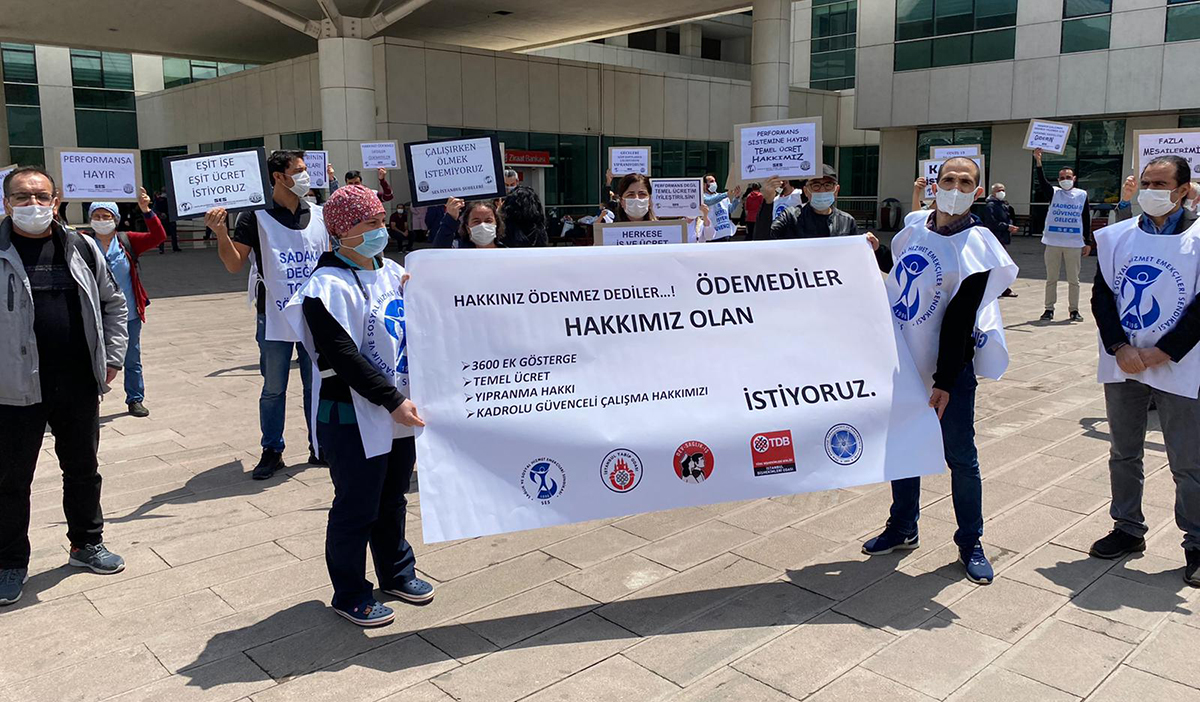 DİSK/Devrimci Sağlık-İş, İstanbul Diş Hekimleri Odası, İstanbul Tabip Odası, SES İstanbul Şubeleri ve Tüm Radyoloji Teknisyenleri ve Teknikerleri Derneği (TÜMRAD-DER) ücret eşitsizliğini ve ödemelerdeki adaletsizliklere karşı eylemleri sürüyor.