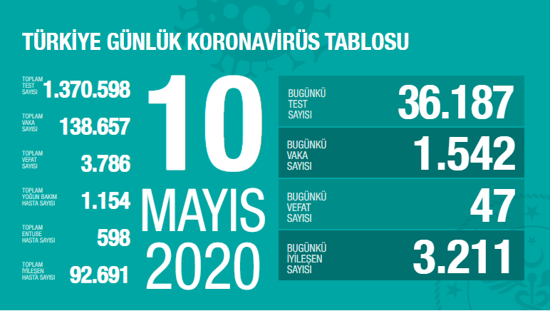 Sağlık Bakanı günlük (10 Mayıs) COVID-19 verilerini paylaştı. Resmi açıklamaya göre bugün yapılan 36 bin 187 testin bin 547’si pozitif çıktı. 47 yurttaş COVID-19 sebebiyle yaşamını yitirdi. COVID-19 sebebiyle yaşamını yitirenlerin sayısı 3 bin 786’ya yükselirken toplam vaka sayısı da 138 bin 657 oldu.