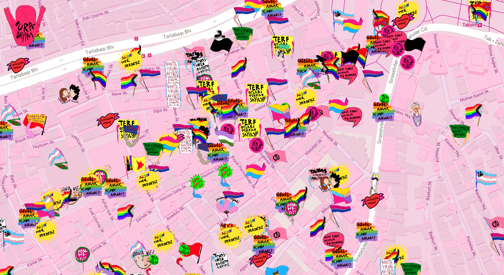 Polisinizle, bekçinizle, ablukanızla “temize çekemediğiniz”, buldozerlerinizle “dönüştüremediğiniz”, inatla, aşkla İstanbul’un her köşesinde yaşayan, yaşatılan hafızalarımız var. Ülker Sokağı yaşamış “99 altın kelebeği”, Avcılar Meis Sitesi’ndeki arkadaşlarımızın direnişini nasıl unuturuz! Gezi Parkı’nın, Başkurt Sokağın, Pürtelaş’ın, Küçük Bayram Sokağın, Kazancı Yokuşu’nun dili olsa da konuşsa! Ya Boğaziçi Köprüsü’nden sallandırdığımız o dev gökkuşağı bayrağı, Fındıklı salı pazarı yokuşunda gökkuşağı renklerine boyadığımız o merdivenler… İzlerimizi nasıl sileceksiniz?! İstiklal Caddesi, Tünel… ah çok özledik. 80’lerde Gezi Parkı merdivenlerinde hayat bulan, 90’larda görünürlük kazanan, 2003’ten bu yana İstiklal’de eşitlik ve özgürlük diye haykıran ve her geçen gün bir araya gelerek güçlenen varlığımızla işte tam buradayız.