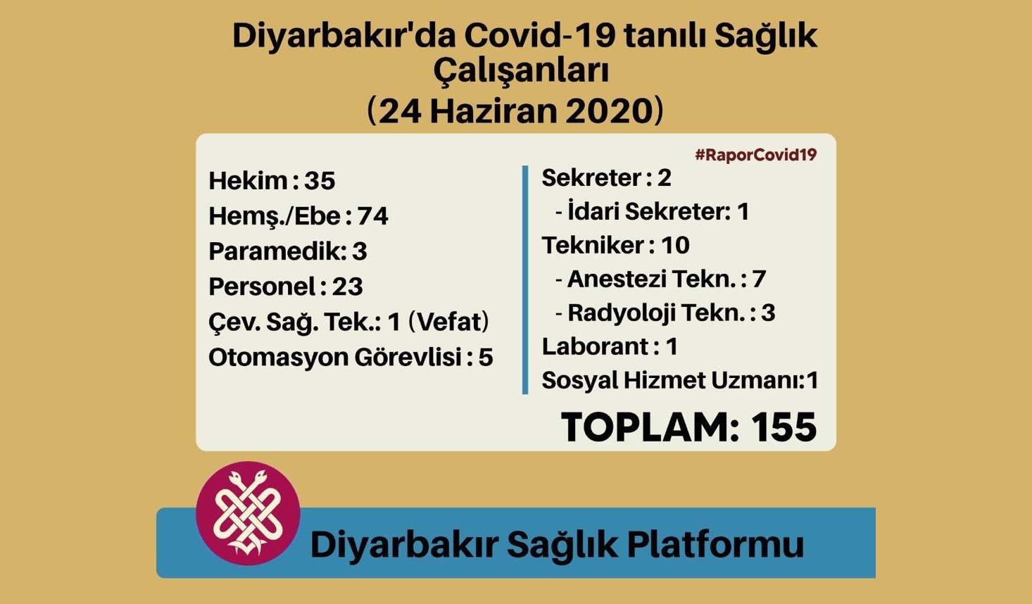 Diyarbakır Sağlık Platformu, kent genelinde yeni tip koronavirüs (COVID-19) tespit edilen sağlık çalışanlarının sayısının 155 olduğunu açıkladı. Ayrıca bir çevre sağlığı teknisyeninin hayatını kaybettiği belirtildi.