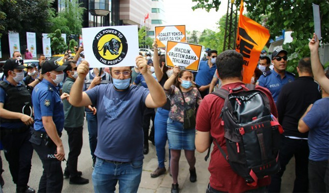 Halkevcilerin “Irkçılık, cinsiyetçilik, virüs, işsizlik, yoksulluk ve kapitalizm. Nefes alamıyoruz” sloganıyla yapmak istediği basın açıklamasına polis izin vermedi.