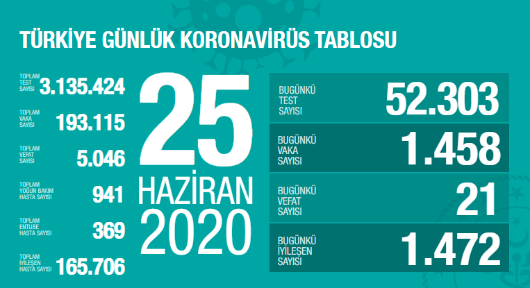 Sağlık Bakanı Fahrettin Koca günlük (25 Haziran) koronavirüs verilerini paylaştı. Bugün 52 bin 303 test yapıldı ve bunların bin 458’i pozitif çıktı. Bugün 21 kişi yaşamını yitirdi.