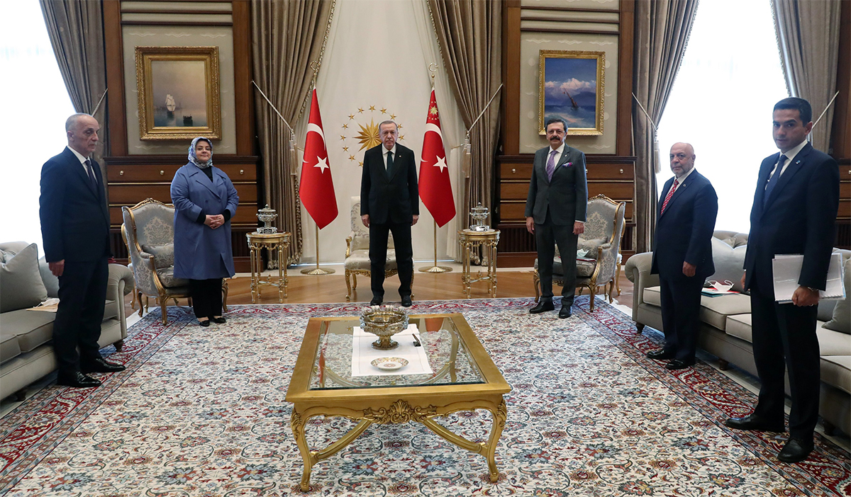 Tayyip Erdoğan bugün (17 Haziran) Aile, Çalışma ve Sosyal Hizmetler Bakanı Zehra Zümrüt Selçuk başkanlığındaki patron örgütleri ve sendika konfederasyonları başkanlarından oluşan heyet ile Saray’da görüşme gerçekleştirdi. Heyette, Türkiye Odalar ve Borsalar Birliği Başkanı Rifat Hisarcıklıoğlu, Türkiye İşveren Sendikaları Konfederasyonu Başkanı Özgür Burak Akkol, TÜRK-İŞ Başkanı Ergün Atalay ve HAK-İŞ Başkanı Mahmut Arslan yer aldı.