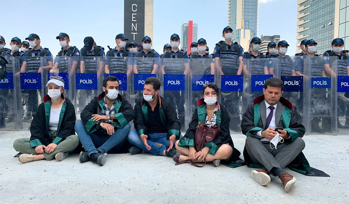 Baro başkanlarının sosyal mesafe kuralını gözeterek ve tek sıra halinde yürümek istemesi de polis tarafından engellendi.