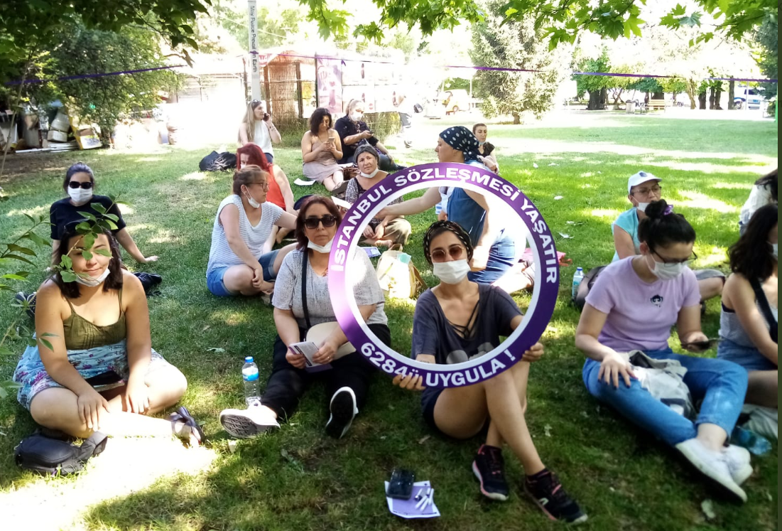 Kurtuluş Parkı’nda bir araya gelen onlarca kadın hem İstanbul Sözleşmesi’ni konuştu hem de sözleşmenin hedefe konulması karşısında nasıl mücadele edeceklerini tartıştı.