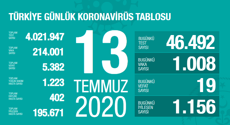 Sağlık Bakanı Fahrettin Koca günlük (13 Temmuz) koronavirüs verilerini paylaştı. Bugün 46 bin 492 test yapıldı ve bunların bin 8’i pozitif çıktı. Bugün 19 kişi yaşamını yitirdi. 1156 kişi ise taburcu edildi.