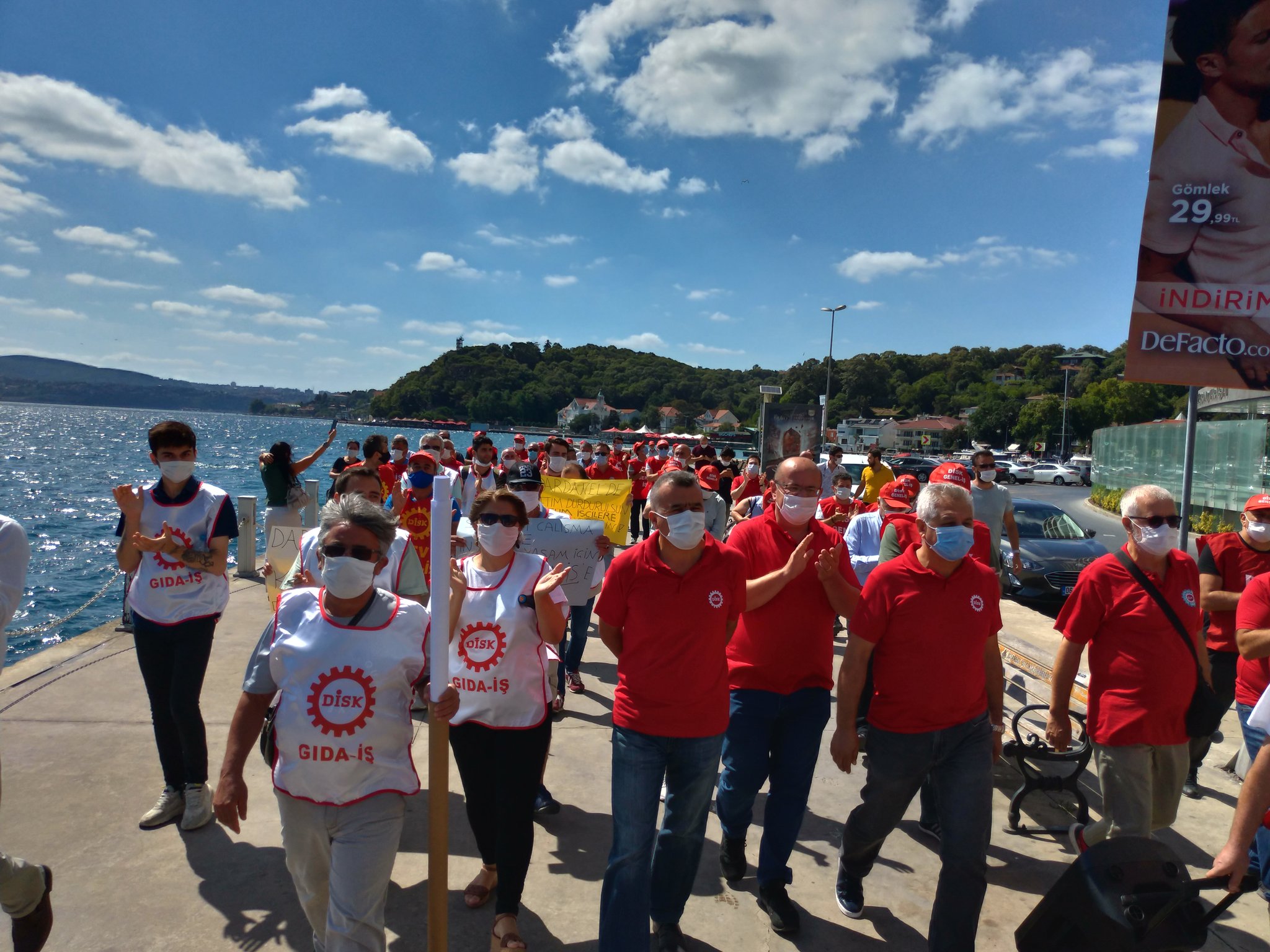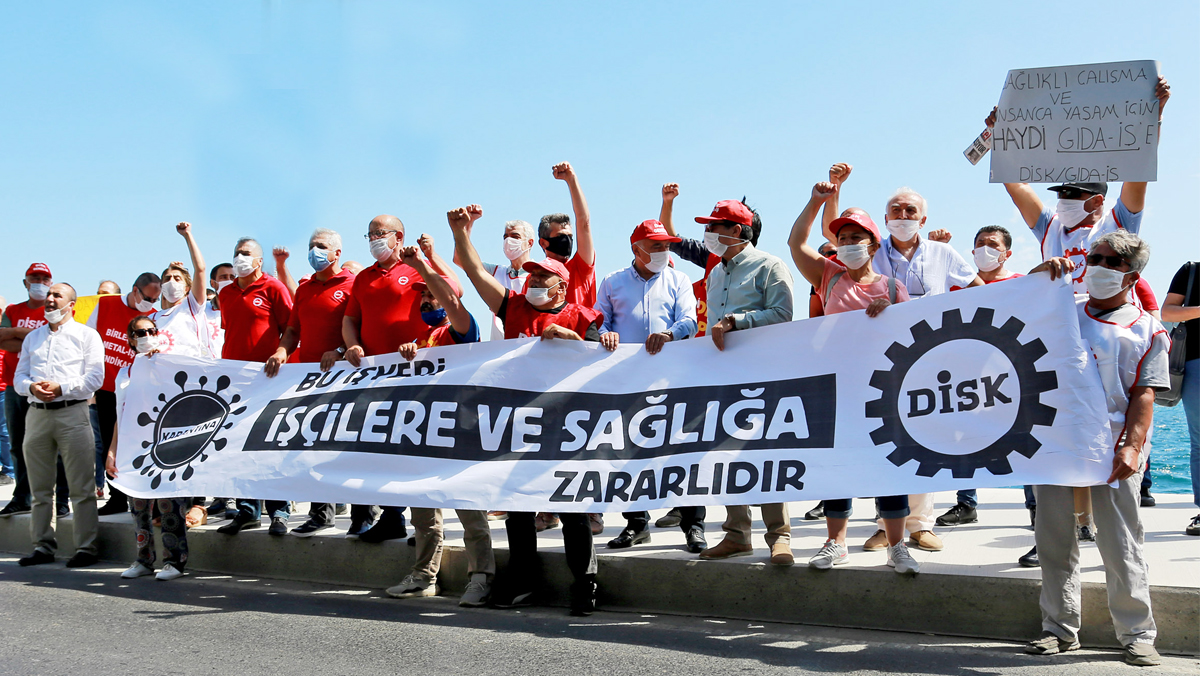 Basın açıklamasını okuyan Gıda-İş Genel Başkanı Seyit Aslan, “Son dönemlerde Covid-19 salgını ülke çapında yeniden hız kazanmış, işçiler işyerlerinde kitlesel olarak koronavirüse yakalanmaya başlamıştır. İşçilerin ve halkın sağlığı pahasına “çarklar dönecek” ısrarı ile duyurulan normalleşme sürecinde, “sürü bağışıklığı” politikası devam etmekte, Covid-19 bir işçi sınıfı hastalığı olarak yayılmaktadır” dedi.