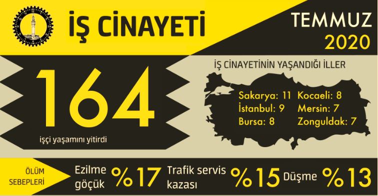 Yüzde 88’ini ulusal basından; yüzde 12’sini ise yerel basın, işçilerin mesai arkadaşları, aileleri, iş güvenliği uzmanları, işyeri hekimleri ve sendikalardan öğrenilen bilgilere dayanarak hazırlanan raporda Temmuz ayında en az 164 işçi iş cinayetlerinde yaşamını yitirdi.