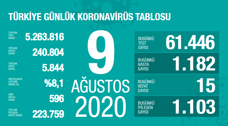 Fahrettin Koca, 9 Ağustos’a ait resmi COVID-19 verilerini paylaştı. COVID-19 nedeniyle 15 hasta daha hayatını kaybederken 1182 yurttaşa COVID-19 tanısı kondu. Bugün iyileşen hasta sayısı ise 1103 olarak açıklandı.